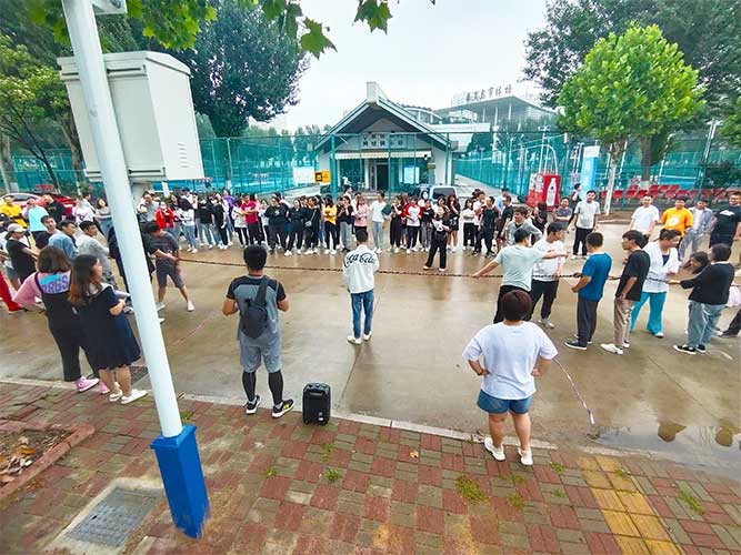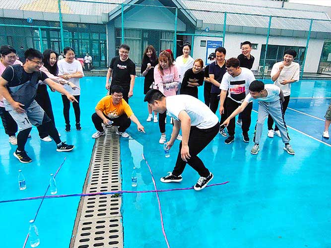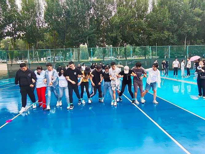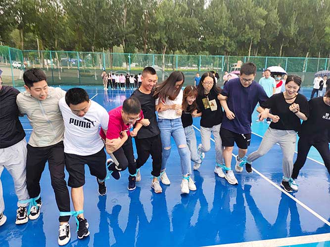 大家一排站好,從左到右,每人的右腿與另一人的左腿依次并齊,并用扁帶繩子系上,繩子綁的位置是腳踝以上部分。聽見哨聲即為游戲開始,從起點(diǎn)到終點(diǎn),按用時(shí)由短到長,取前五名依次加分。