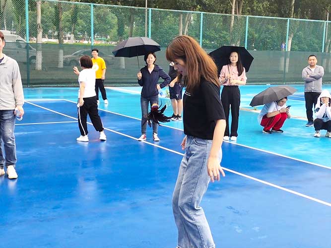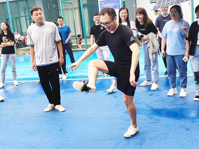 這是為女生們準(zhǔn)備的個人賽,同理,男生也可以挑戰(zhàn)。參加者每人一次機會,踢毽子在不間斷、不落地的前提下,個數(shù)*多者勝利。并且冠*可以直接去選一個獎品拿走。